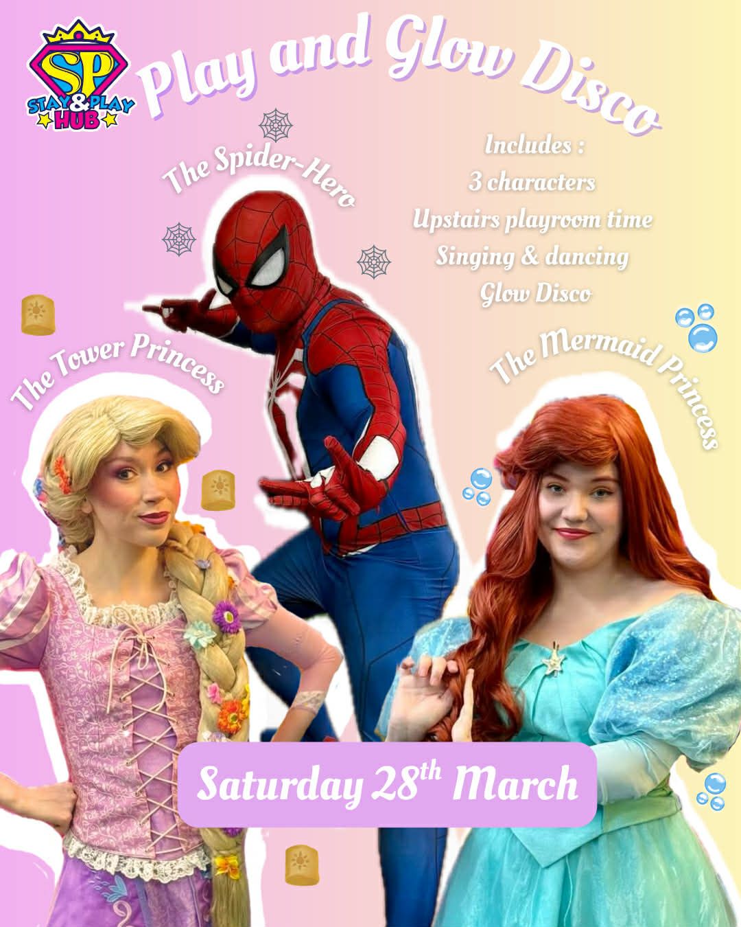 Join us on Saturday 14th March, 10:00-11:00, for a 1-hour session which will showcase some of the things we offer - you'll spend 20 minutes upstairs, playing in our role play and soft play areas, joined by our special guests. They'll then take you downstairs to be entertained by some singing and dancing for 20 minutes. Finally, we'll transform our downstairs space into our Glow Room and have a 20 minute Glow Disco, busting some moves with our special friends.